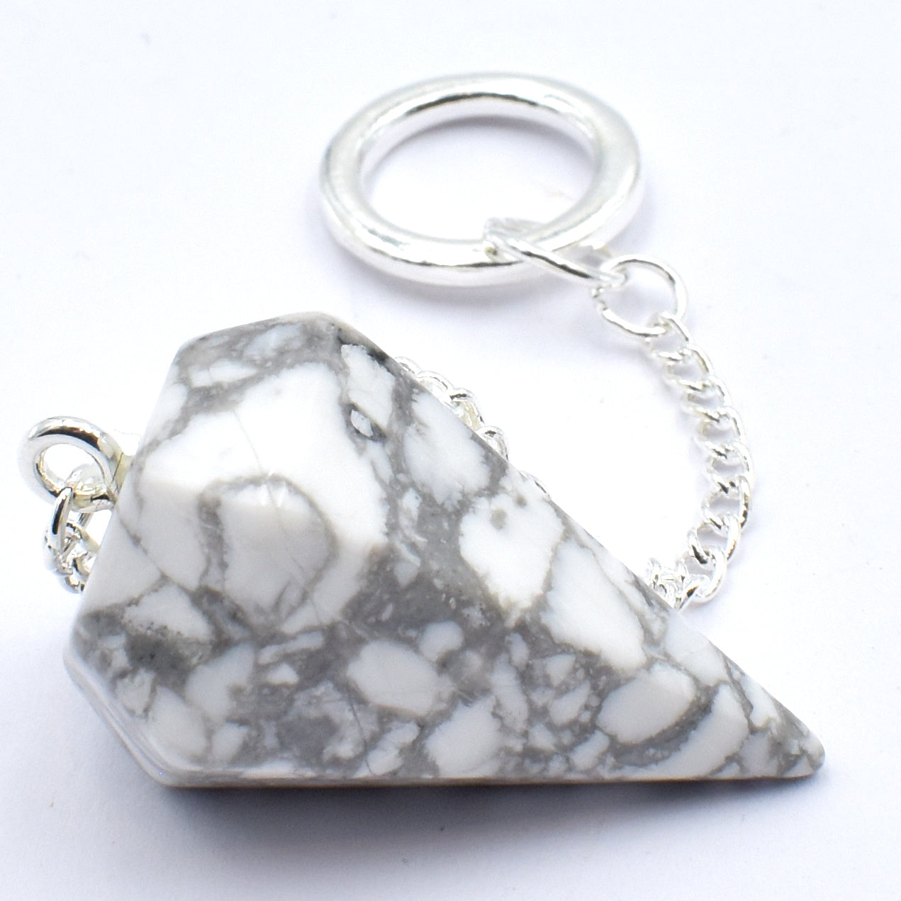 A 6-sided hand-carved White Howlite Pendulum, length 4 cm. Quality silver chain.