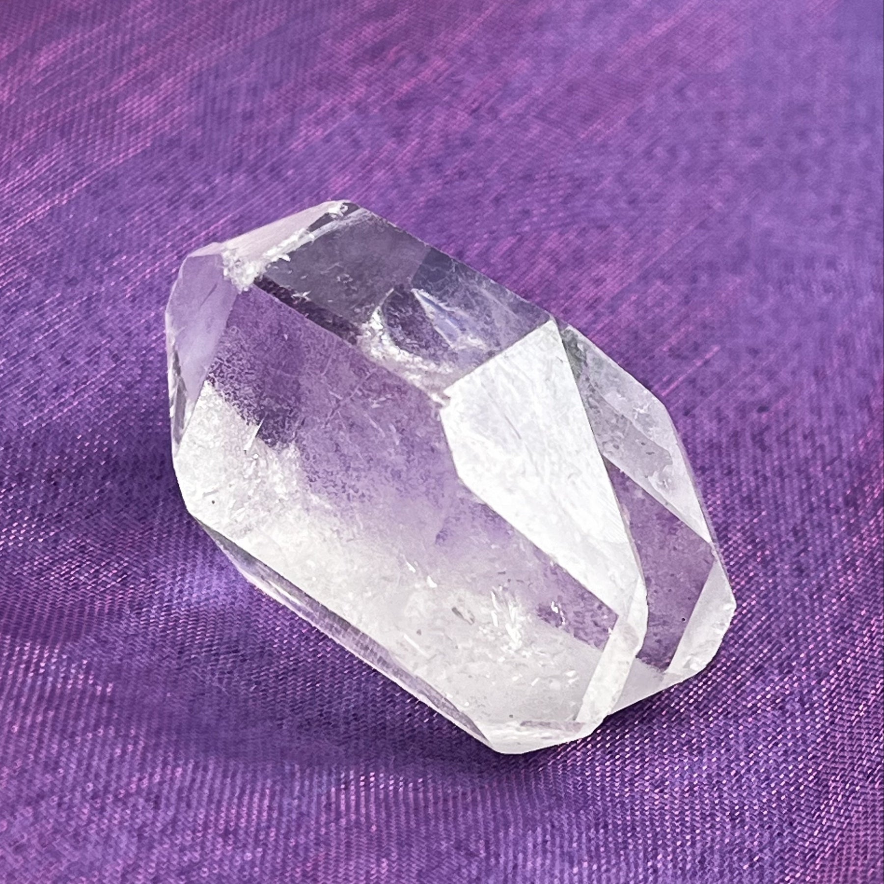 This exquisite double-terminated clear quartz point features a twin termination at one end and a pyramid face etching on the single point. A rare and powerful formation, it channels energy in both directions, creating perfect energetic balance.
