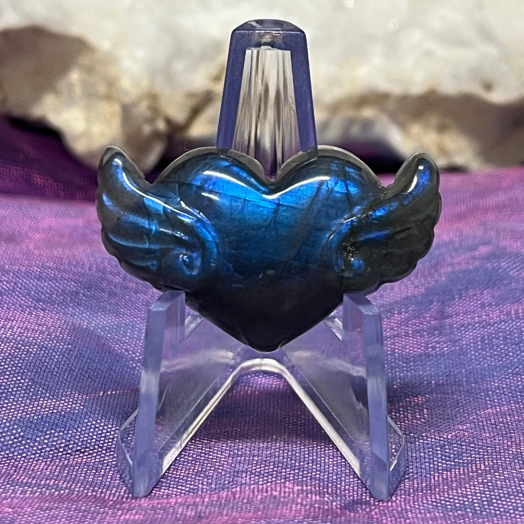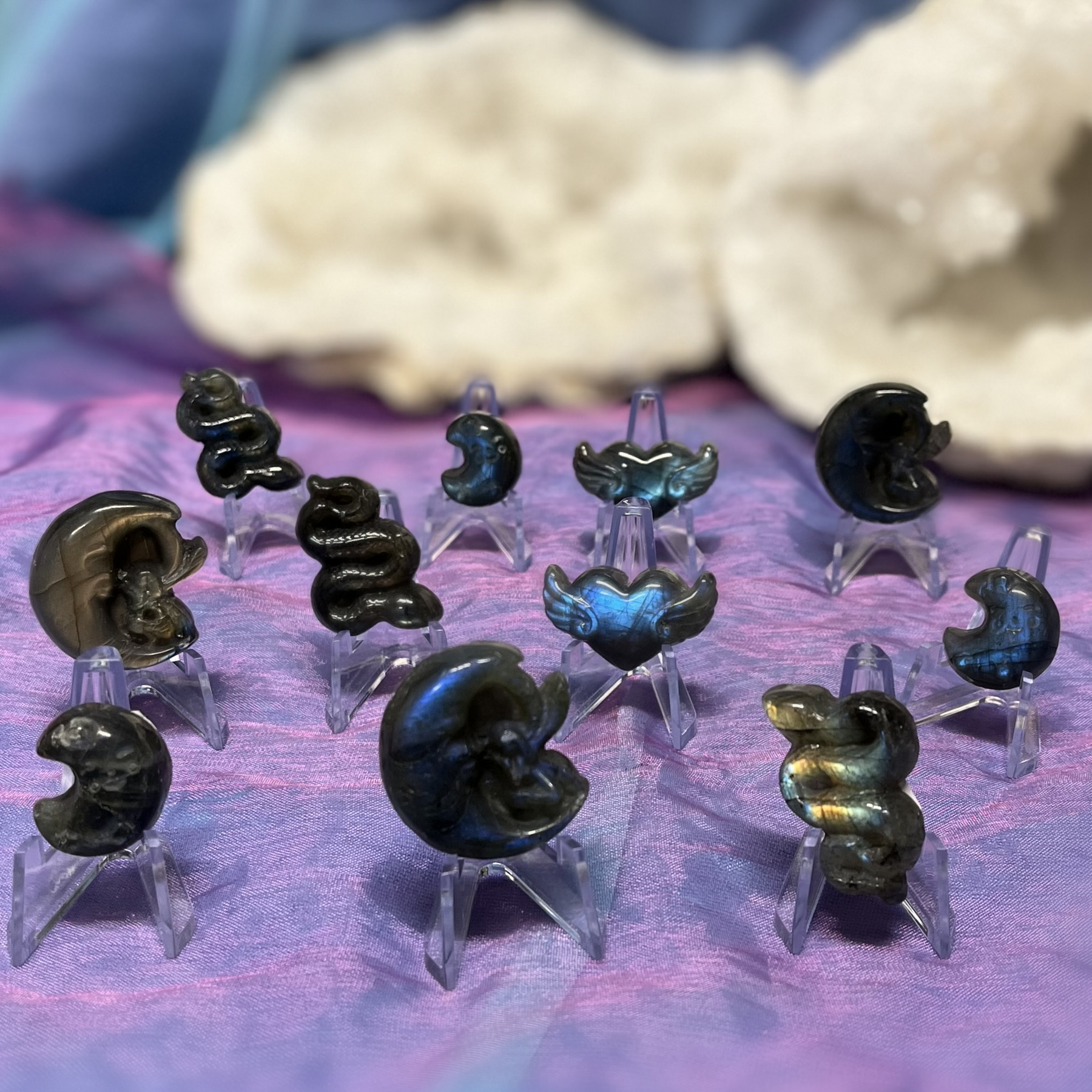 These enchanting mini carvings are sculpted from high-grade labradorite, each one shimmering with flashes of blue, gold, and green. Featuring crescent moons, winged hearts, and serpents, they are perfect talismans for protection, intuition, and transformation. Labradorite is known as the stone of magic, awakening your inner vision and shielding your aura. Ideal for altar displays, pocket totems, or meaningful gifts. Carry the mystique of the moonlight wherever you go.
